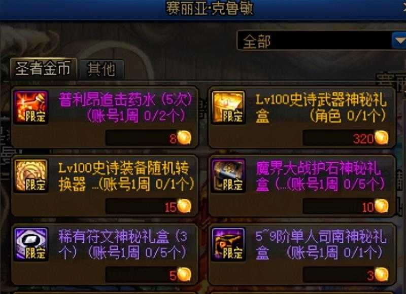 赛丽亚商店当中可以兑换Lv100史诗武器神秘礼盒与LV100史诗装备随机转换器(2个),前者兑换需要消耗320圣者金币,打开之后可以获得一件符合当前职业的史诗武器。后者兑换需要消耗15圣者金币,使用之后可以将当前史诗装备随机转换成其它任意百级史诗装备(工作服除外)。