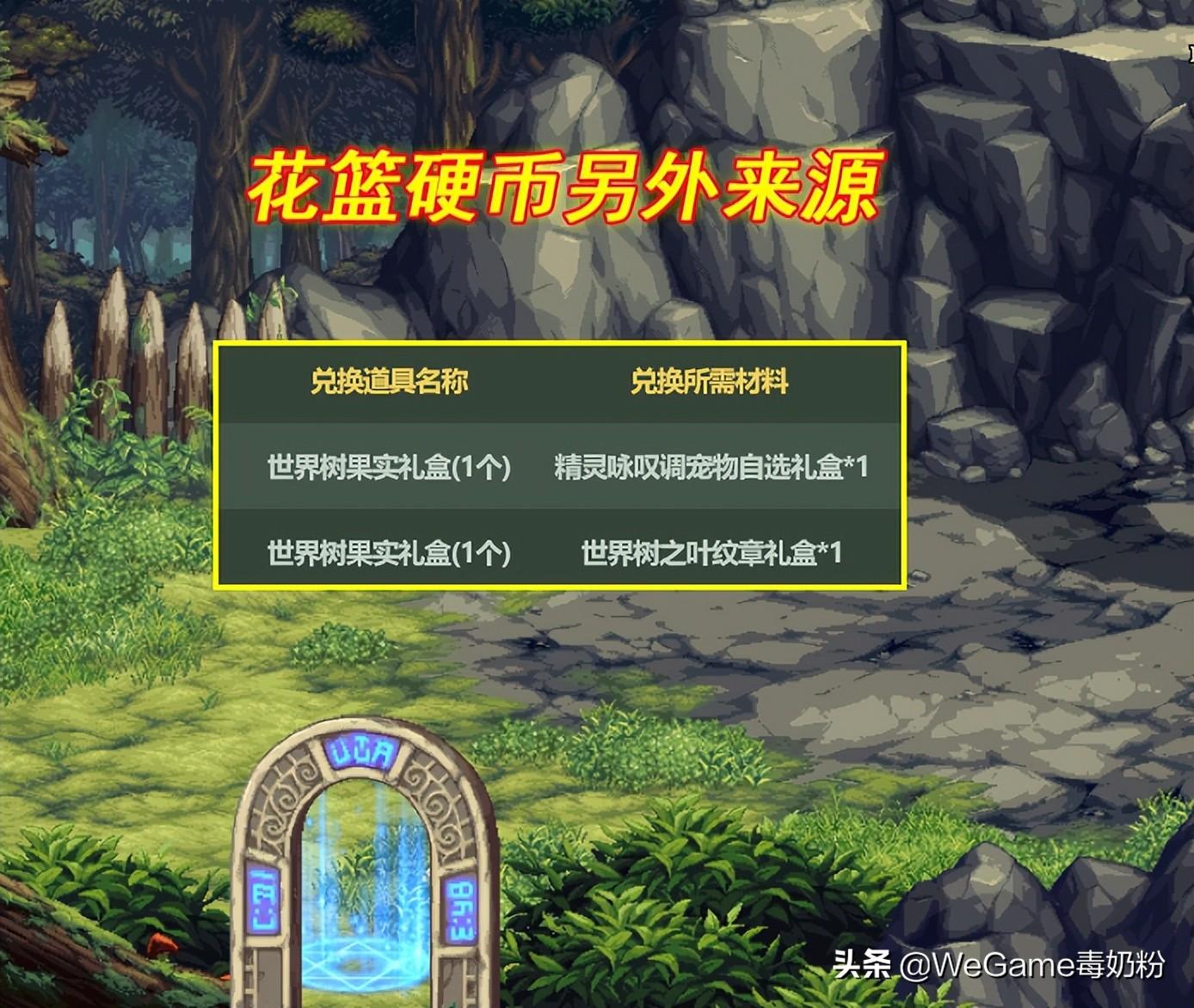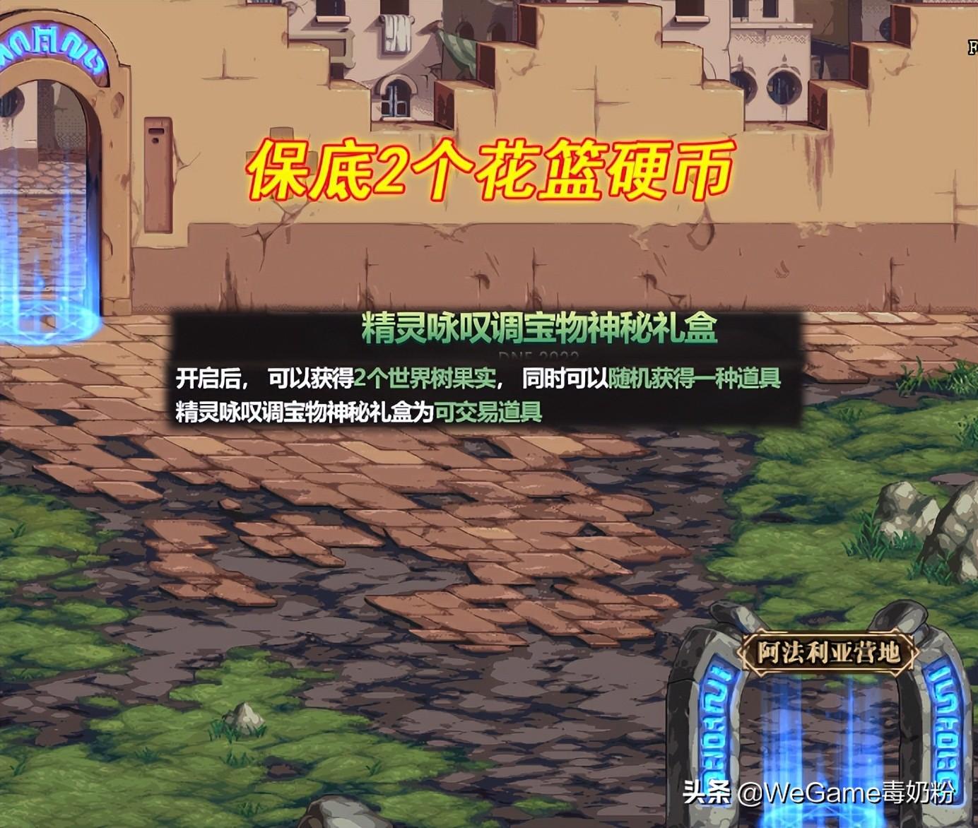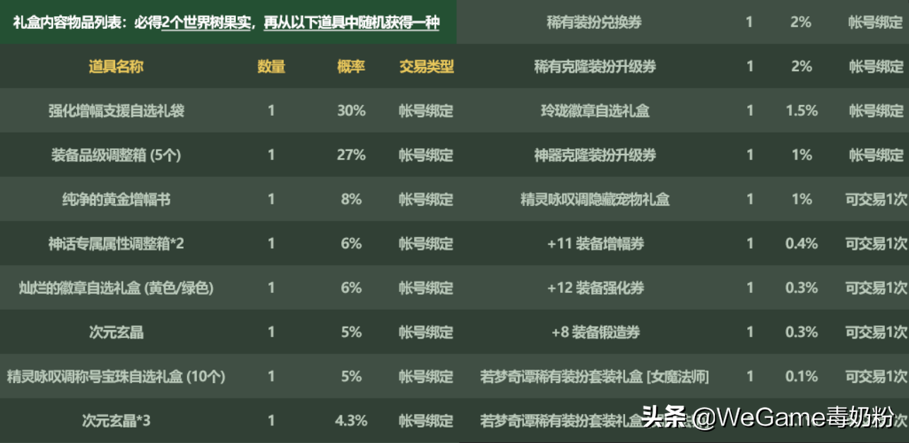 精灵咏叹调宝物神秘礼盒:开启后必得2个世界树果实(花篮硬币),同时可随机获取1种道具。好家伙,礼盒2+1的模式首次问世,这下氪金无极限了。