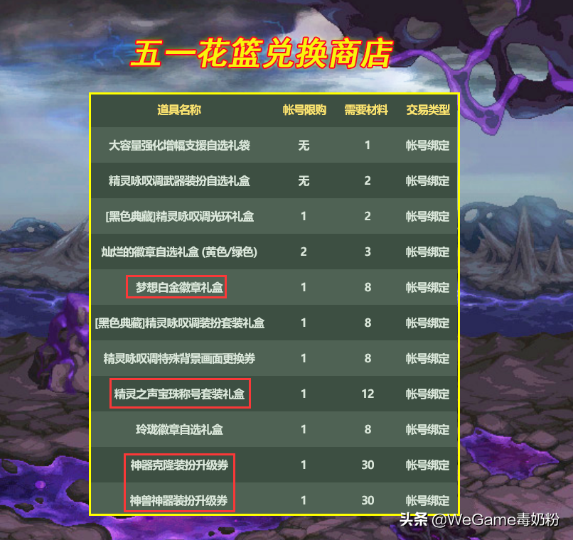而“世界树果实”的另外1种来源就有点坑了,普通精灵宠物和五一纹章1比1兑换,实在没地方用再选择,注意1个细节,“五一神秘宝物礼盒”可交易,这就意味着你不用买五一套,也能兑换五一花篮的各种道具。“金币”相当于“点券”的作用了,风暴航路、奥兹玛3牛、未央副本搬砖走起!
