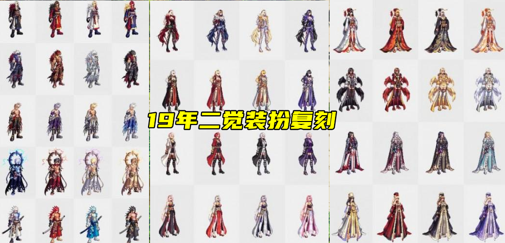 然后是19年的【二觉装扮】套装,这一套时装应该说是非常经典,前几次缝纫机好像都没有推出过,属于首次追忆套装,尤其是剑神套装人气最高,复刻了当初二觉时的插画,比三觉还要经典,另外修罗哥、剑帝、神女外观也都不错,最低调的反而最耐看。
