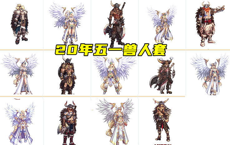 【20年五一套】,又被称之为兽人套,每个职业都是穿着又大又厚的衣服,时装本身还颇具特色,但愣是给女职业加上了不伦不类的大翅膀,看起来就有点尴尬了,当然了,换个角度看,也可以说是特色鲜明。