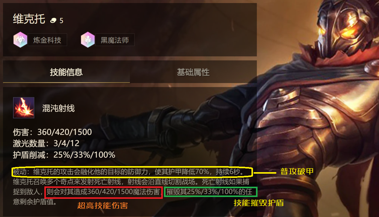 维克托不仅技能伤害高,普攻自带轻语特效 会有70%的破甲效果,技能还可摧毁敌方护盾值 ,强度并没有想象中那么差。
