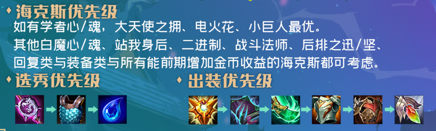 其他白魔心/魂、站我身后、二进制、战斗法师、后排之迅/坚、回复类与装备类与所有能前期增加金币收益的海克斯都可考虑。