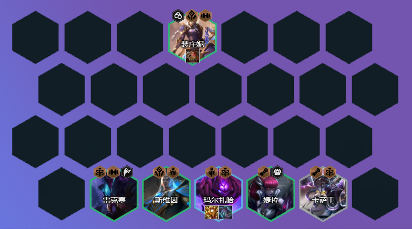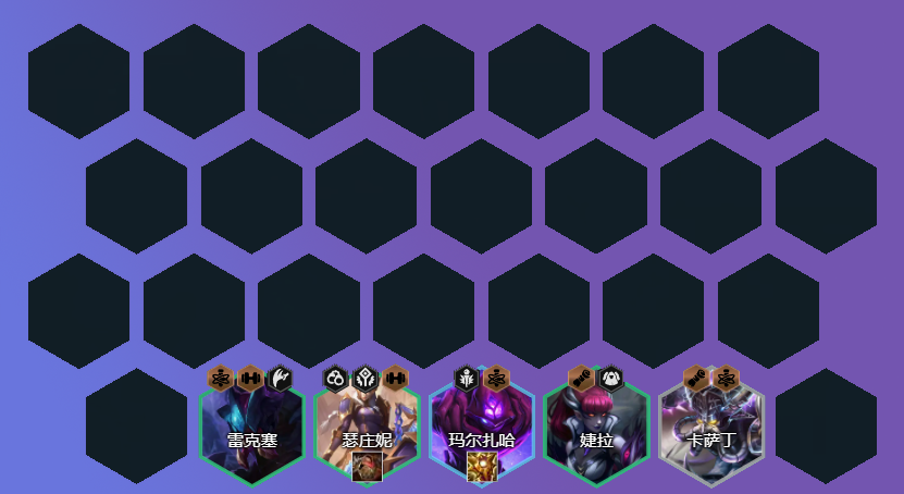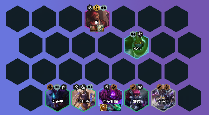 如扎克/雷克塞+蔚+阿狸/蚂蚱 ,可组成2斗士+3炼金或3变异羁绊,2斗士增加全员血量,蔚的技能有护盾,在3防装下坦度比较高,扎克还能提供控制,选择雷克塞需要变异是森林或源计划,或为了9人口补卡莎;