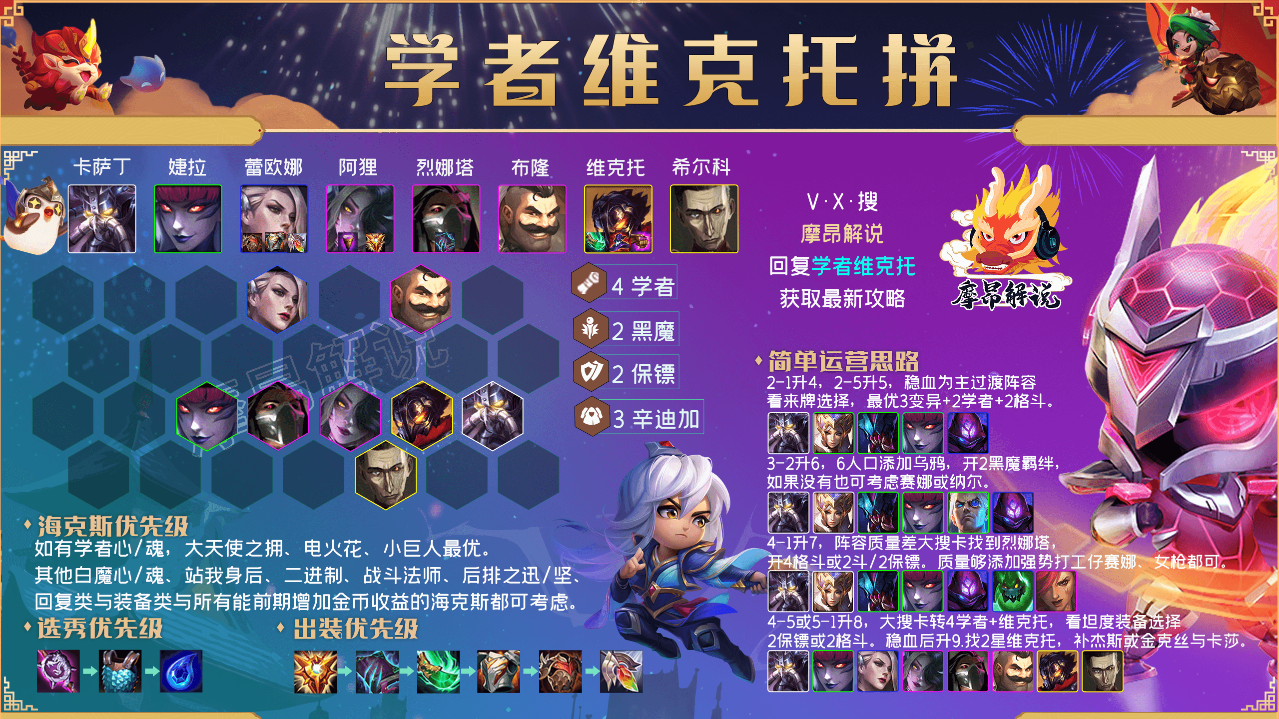 这是一套拼多多阵容,4学者+维克托为核心 ,其他棋子均可看情况选择,变阵需要看对局情况,和自身海克斯和转职情况选择。