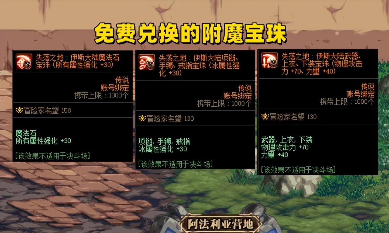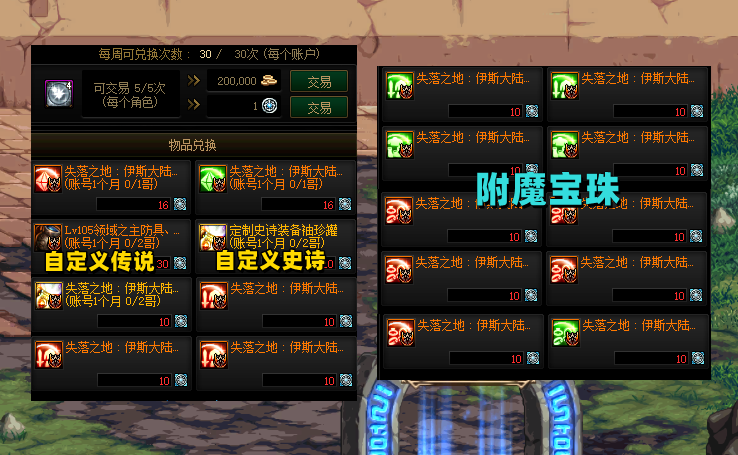 每个月可兑换2个自定义史诗罐子;每个月可兑换1个自定义传说罐子,并且还可以交易;魔法石30属强宝珠,现阶段最顶级附魔;上下衣70+40宝珠,也算是次顶级附魔;