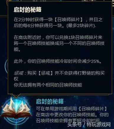 启封的秘籍,可以减少25%的召唤师技能cd,可以在游戏中不断的更换召唤师技能。配合同为启迪系的星界洞悉,