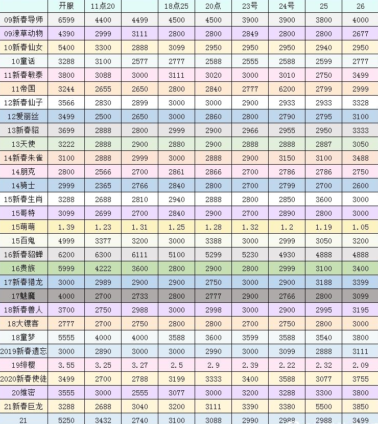 这里有一张贴吧大佬统计的时装售价浮动表格,记录了上一次缝纫机活动的时装价格变化,和本次缝纫机内容基本上雷同,也算具有很高参考性了,来分析一下变化行情。