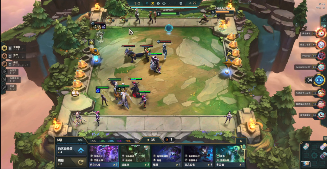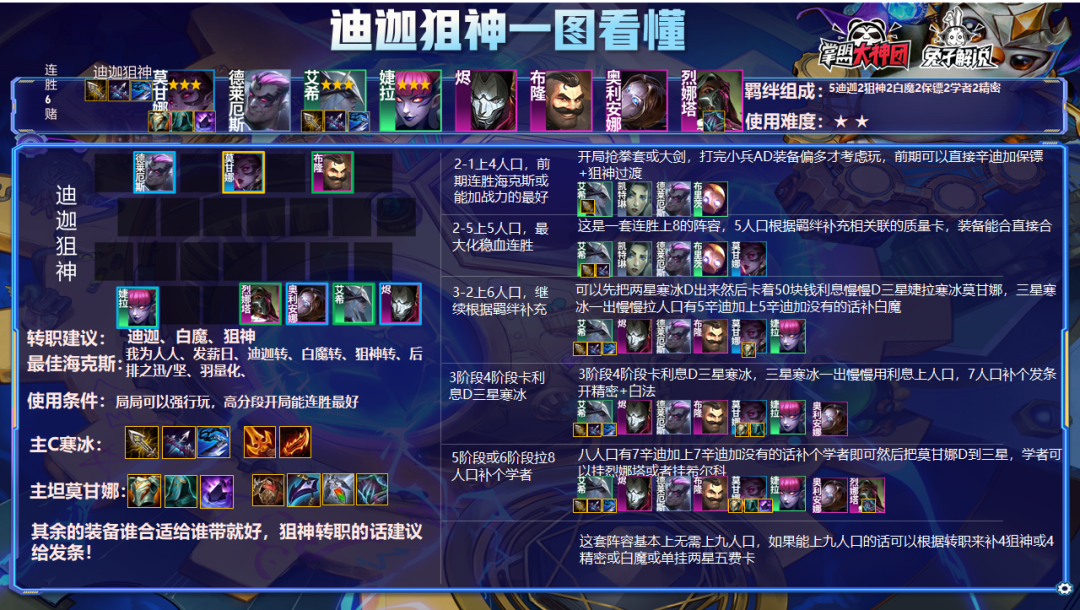 6阶段的话基本上是D三星莫甘娜,如果你的莫甘娜很早就三星的话可以选择上九人口根据转职挂大羁绊!4狙神或者4精密或者白魔或单挂两星五费卡,甚至可以在八人口追三星四费卡!这把因为我有DD街区所以我选择D三星四费卡!