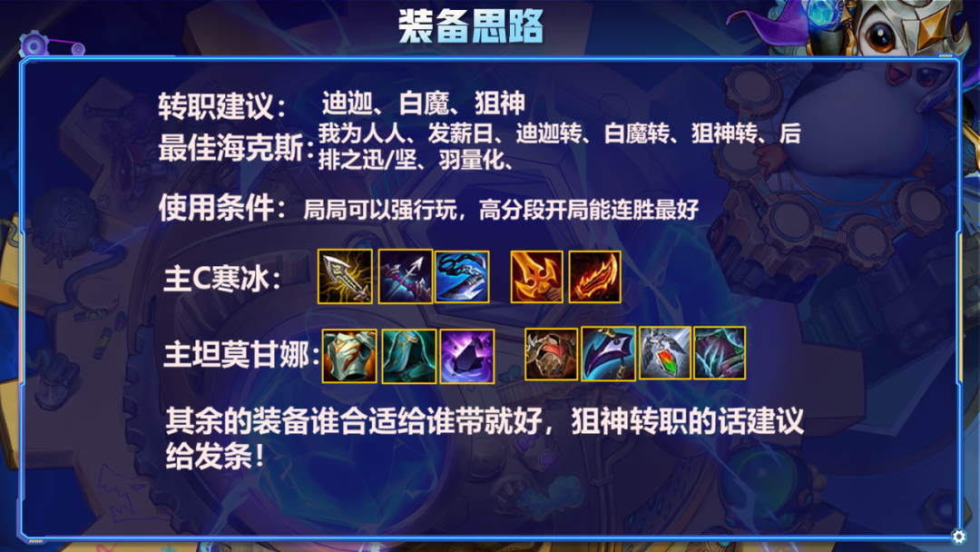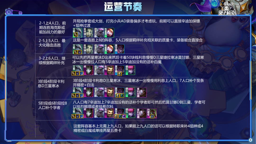3-2拉6人口,尽量确保3-2换成体系牌,这样3-3的海克斯不会乱出烂掉。没质量需要先大搜2星寒冰,有质量可以卡着50慢慢D3星寒冰,寒冰数量7张左右或者最晚5-1需要大搜牌冲出3星寒冰,有同行可以看情况提前冲抢牌,一定要确保有能出3星的经济再去大搜抢牌。一般没啥同行,就算有,赌2费的寒冰可以2家到3星寒冰,有经济都可以到。这个阵容3星必追寒冰跟莫甘娜,然后可以追个婕拉带多余法装挺不错!