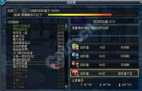 所谓的活跃度,就是在游戏中会给你一些指示,只要你完成了这些指示,就会给与你奖励,100分以上可以拿到金牌,90~99是银牌,80~89是铜牌,3个银牌可以换1个金牌,3个铜牌可以换1个银牌