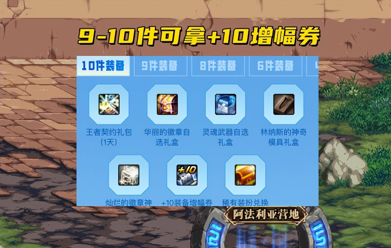 因为只有基础副本爆出才有效,所以推荐用经常爆肝、但不怎么刷高级副本的角色进入,爆装奖励还是比较丰厚的,爆出9/10件指定装备,可以拿到+10增幅券,专属于欧皇的福利。