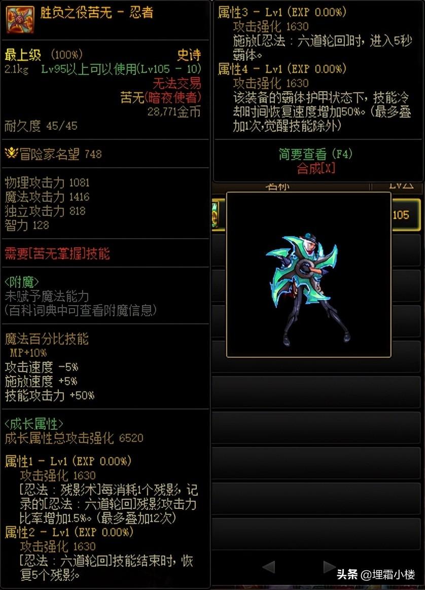 苦无是忍者经常使用的小型武具,形状如一把短剑,多以铁制,体积短小,容易携带及藏匿。然而这把史诗苦无属实却颠覆了大伙儿的想象,不仅体型巨大,而且4面开刃,宛如一个大型回旋镖,光是看着就已经觉着威力不俗。据说强化+13后,粉色光与蓝光结合,霸气十足,不知道勇士们有没有见到过?