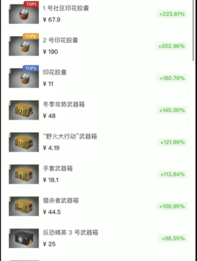 也就是因新规受到最直接影响的物品,明明是4号出的新规,开始更新,但箱子在4号之前就开始被人拉涨了,越是热门涨得越多,再结合很多箱子产物也是提前大涨,很明显,有内鬼提前收到了这次更新的内容,提前操作了,然后就是韭菜,市场疯狂,韭菜也拼命,我们要理性消费,不要当韭菜,别人拼命至少能赌上一把,但韭菜拼命就只能是拼命送钱,别人炒箱子,韭菜竟去炒胶囊,把不限量的内购胶囊都炒上去。