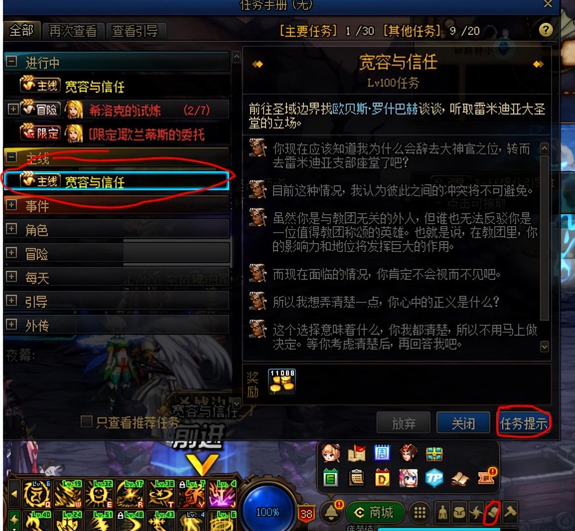 首先先来说升级问题,回归玩家可能找不到地图,依次打开任务打开任务提示跟着指示走即可。省疲劳刷法:101、103、108、109级时点跳过任务,这样升到满级需要大约490左右疲劳,跳过任务刷法到满级大约能够得到400W金币左右,所以不想节约疲劳的玩家可以直接不跳过获取更多任务金币奖励以及一系列基础附魔。