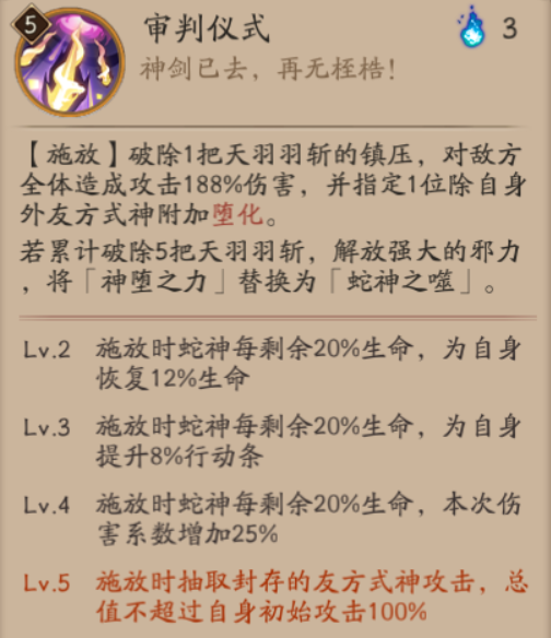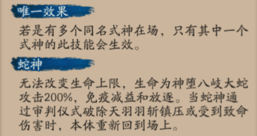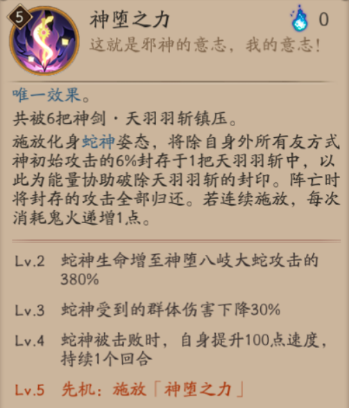 使神堕八歧大蛇化身为蛇神姿态,期间将除自身外的友方式神初始攻击的6%封存在其中一把天羽羽斩中,会提升自身的输出量,在阵亡时所封存的攻击力全部返还。