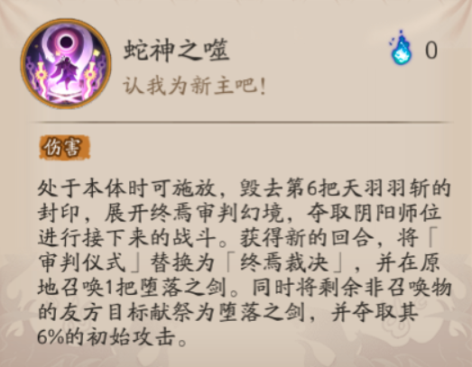 在破除5把天羽羽斩封印后,神堕八岐大蛇二技能将可以篡位阴阳师,此时大招「审判仪式」会转换为「终焉裁决」。