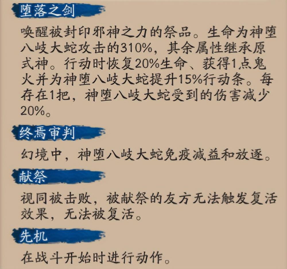 此召唤物的生命值为神堕八岐大蛇攻击的310%,剩余其他属性则继承原目标的面板;「堕落之剑」在行动时会给自己恢复20%的生命、并给队伍回复1点鬼火且给神堕八岐大蛇提升15%的行动条,「堕落之剑」每存在1把就会让神堕八岐大蛇受到的伤害减少20%(全部共5把,即完整体减伤高达100%)。