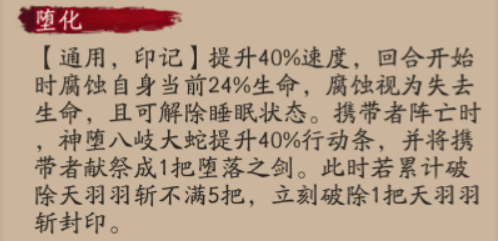 在神堕八岐大蛇释放大招时,可以施加给友方目标的印记;可以给目标提升40%的速度,但目标在行动时会腐蚀自身当前24%的生命(腐蚀视为失去生命,可以靠此解除睡眠状态)。