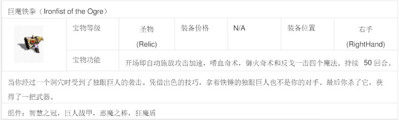 食人魔铁拳:开场自动释放攻击加速、嗜血奇术、烈火神盾、反戈一击,四个魔法,持续50回合。由狂魔棒+至高法师王冠+独眼王护身甲+狂魔盾组合而成。