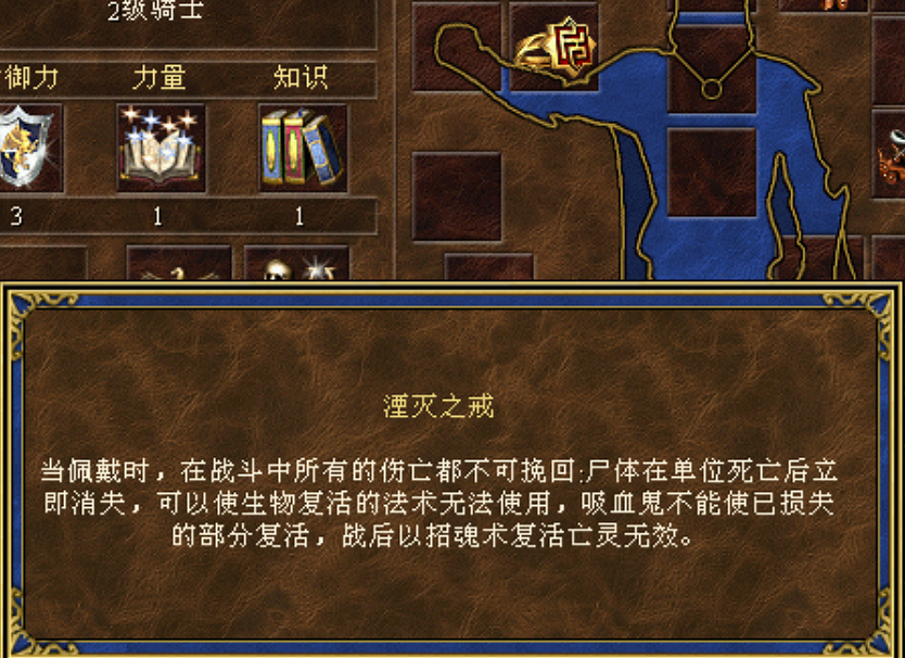 湮灭之戒:战斗中所有伤亡都不可挽回。部队死亡后尸体消失。可以使生物复活的法术无法使用,吸血鬼无法吸血恢复数量,战后招魂术失效。