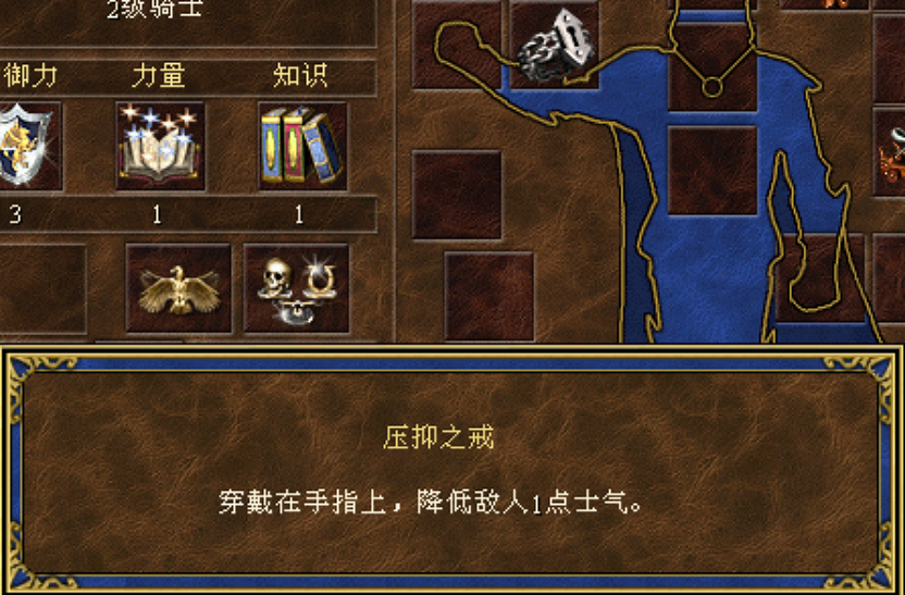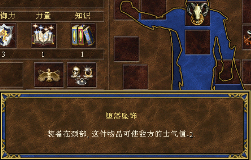 点评:对战神器,三件套降低敌方4点士气。除了对亡灵族没有影响,对于其他种族,对战中带上这三件装备,遇到没有任何士气加成的敌方英雄,对方兵种会因为士气低落而无法出手攻击,降低士气对于野怪也有效果。