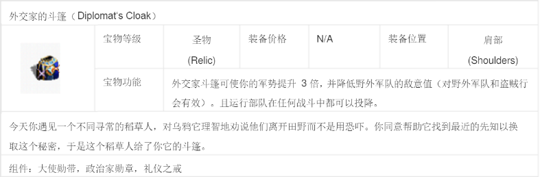 外交家斗篷:降低野外军队敌意,并且在任何战斗都可投降。由政治家勋章+礼仪之戒+大使勋带组合而成。