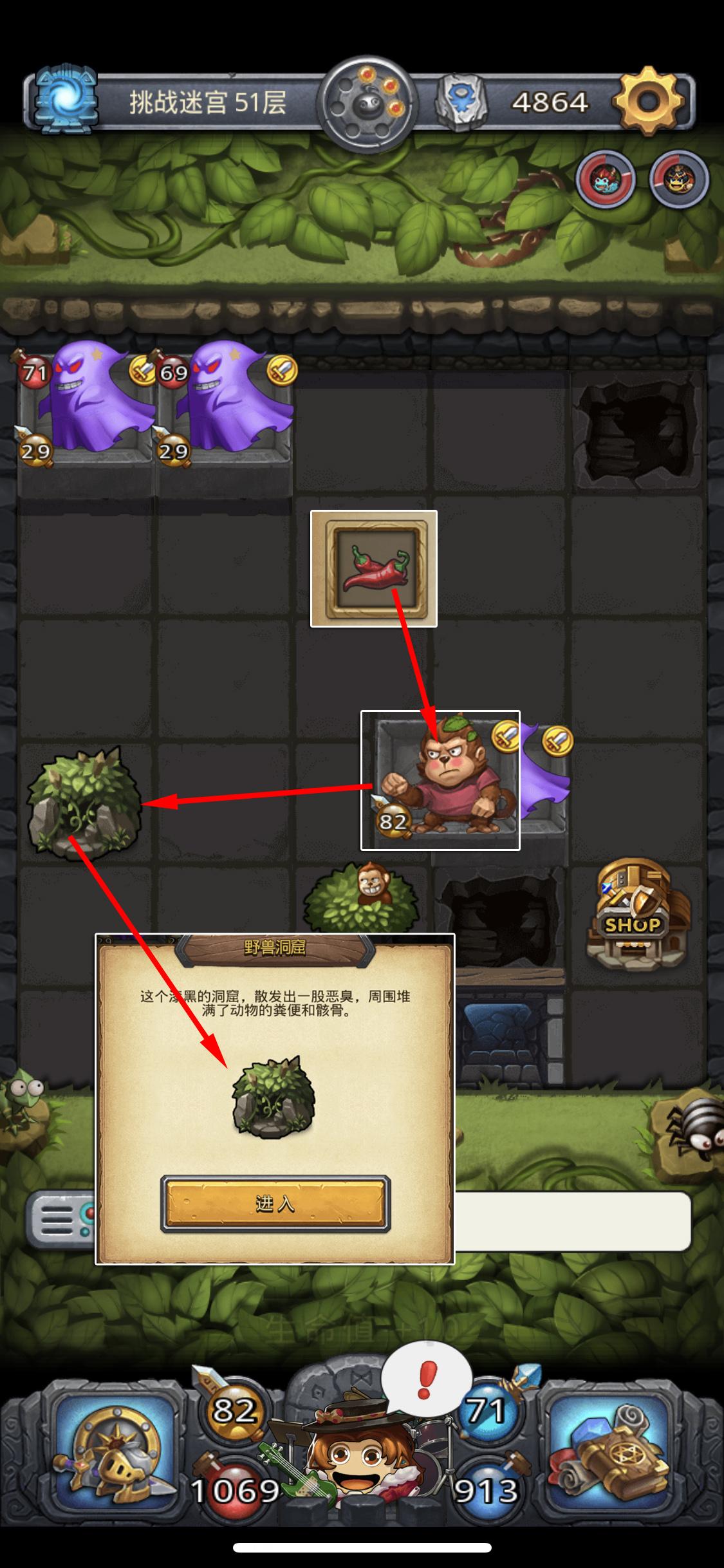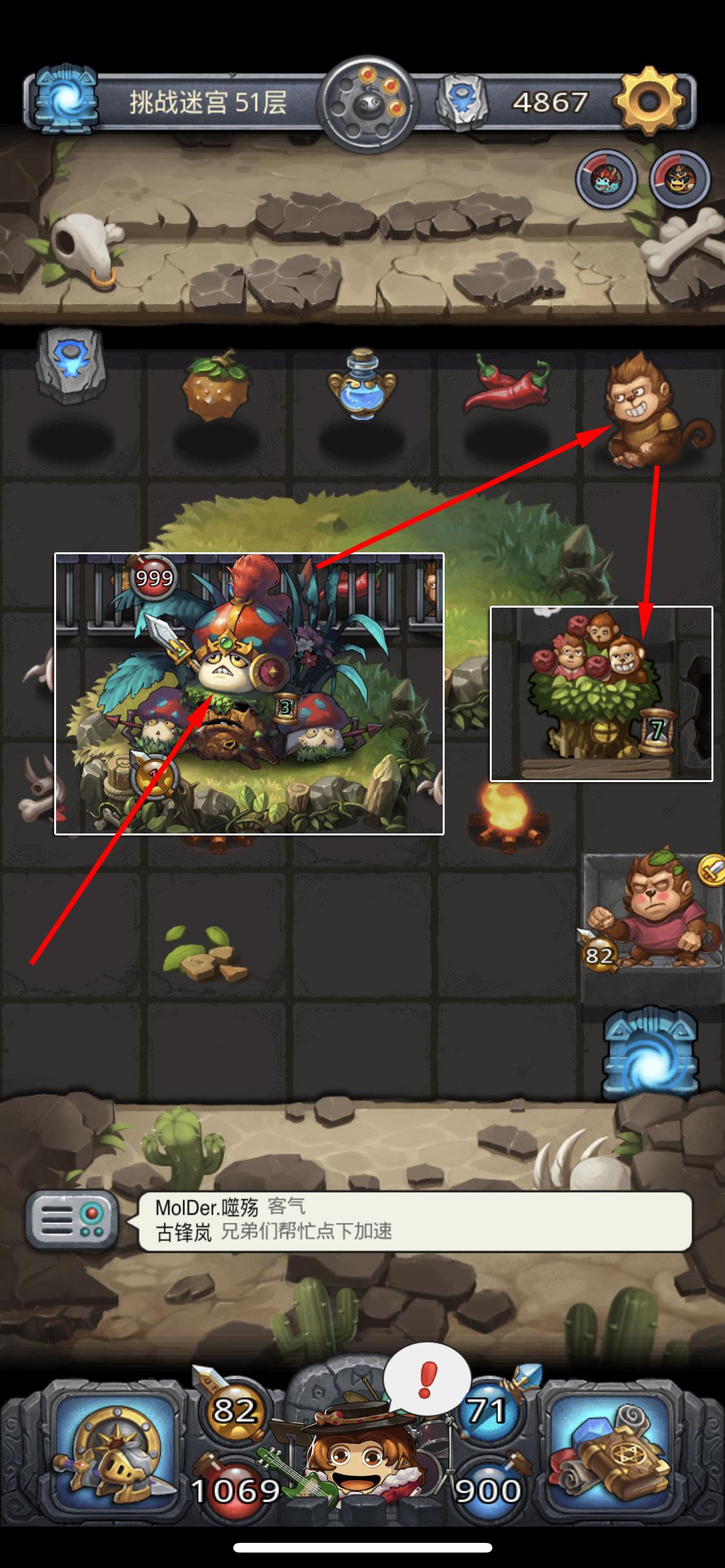 树屋1轮投掷3个道具,首先会遇到一个特殊的野兽洞窟(洞口没有野猪),进洞之前先使用辣椒招出猴子在进洞。进洞后将BOSS击败救出猴子,3层后猴子会离开,再向上2层猴子会带着一只小猴子回来,这时就可以1次抛投3个道具了。