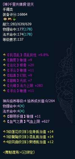 此号属于150顶尖号,五级套加一身三级减伤宝石。高双法躲,武器的属性是不可修,衣服更是双不可修。满满的安全感,966的敏捷配合一背包的满补天试想能把你控到恶心删号退游戏 另外此号的出战附体也是极品属性宝宝。不足的地方是对于神兵的打造不是非常的完美,四级神兵。另外宝石的镶嵌以及鞋子或者其他装备的抽冰打造的还是有待于提高的。13级家园的属性1.46万的气数也是极品的家园。坐骑是2012年春节活动的最顶尖坐骑龙。 此号的售价还是蛮高了一点,但是在装备的属性以及各类的指标来看还是值得去入手一个大神魅的。