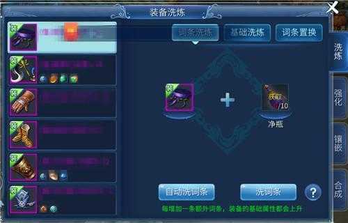 1.词条洗练:把装备属性词条洗掉换来新的词条属性。需要物品:净瓶