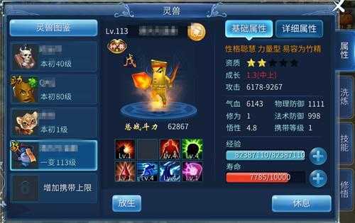 3.技能:让灵兽学习新的技能以及技能升级。
