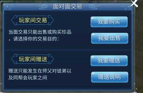 玩家赠送:仅限于帮会玩家、师徒关系进行赠送交易,有一定的受赠积分。