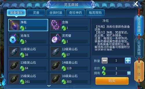 在商城系统中分为两种,一种是【灵玉商城】,一种是【元宝商城】,在商城中可以购买一些常需要的东西,例如时装、吴山石、银两、银票等等。
