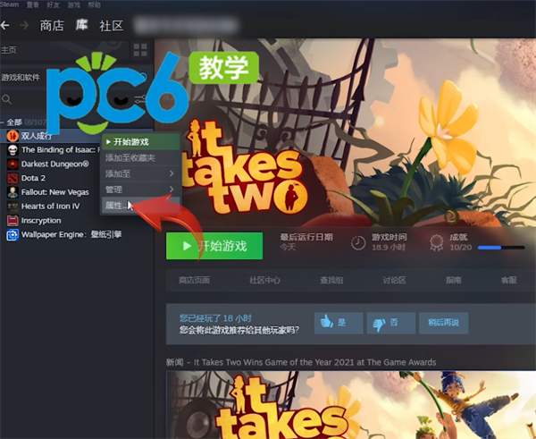 1.双人成行并不能在游戏设置语言,以steam为例需要在客户端中设置语言,而origin版的双人成行则是由客户端语言决定的。steam中在游戏库存中找到游戏双人成行,鼠标右键点击游戏并下拉选择属性。