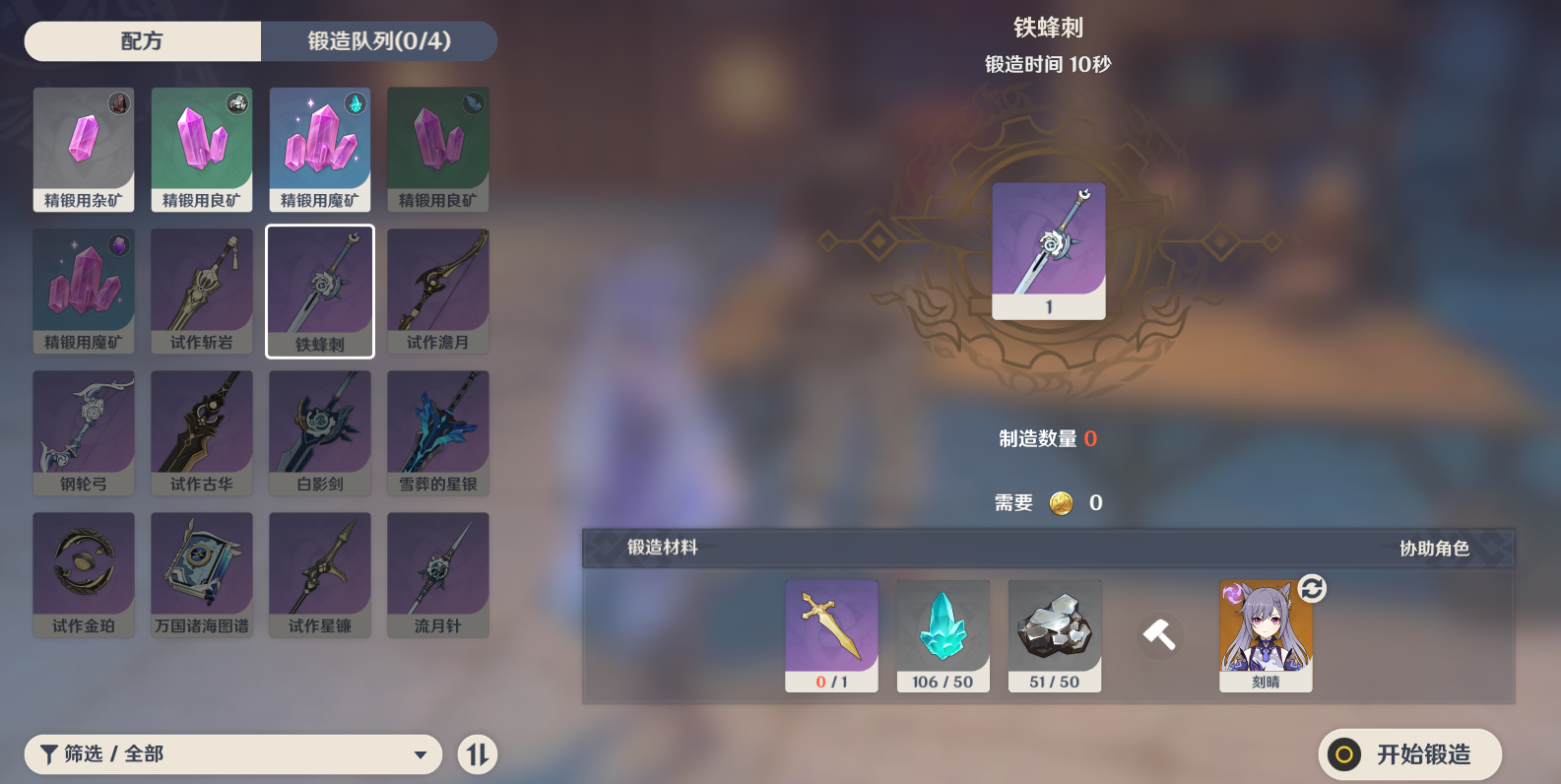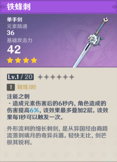 铁蜂刺可以在铁匠处直接锻造合成。这把武器和试做斩岩相反,这把武器词条加的是元素精通技能也是造成元素伤害后提高伤害,非常容易叠加。