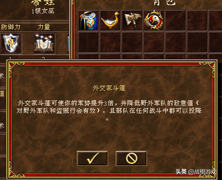 ②外交家的斗篷:外交三件套合成,外交家斗篷可使你的军势提升3倍,并降低野外军队的敌意值(对野外军队和盗贼行会有效)。部队在任何战斗中都可以投降。小辉点评:增强是增强了,只是现在标准地图里外交必须花钱,部队总值的一半。囧,小心看管钱包吧,不小心就会破产。部队在任何战斗中都可以投降,这个设定相当有趣,感觉可以搞出很多有意思的打法出来,比如HR,用钱砸死对方!小辉测试:经过测试,敌人有战争镣铐的情况下,我方有外交家斗篷依然不能投降。结论:战争镣铐是最高优先级。