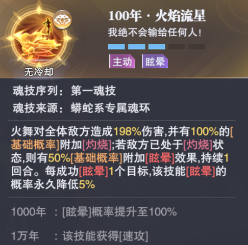 首先马红俊开场便会利用【凤凰啸天击】给对方全体施加【灼烧】状态,这个状态随后会被火舞的第一魂技【火焰流星】所触发并且极大概率将对方全员眩晕住,接着宁荣荣对大家释放加速效果,然后焱用出自己的第一魂技【地狱岩浆冲】再对对方全员施加【灼烧】状态,接着鬼魅的第一魂技【地狱魍魉】会在给我方全员回复能量的基础上再次触发对方的全员【灼烧】,最后马红俊再用自己的第四魂技【凤凰炽焰焚】来对敌方进行2回合的固定灼烧,类似这样的技能衔接我们都可以通过对各位魂师速度属性的调配来达到(除敏攻和强攻系魂师外的职业都可以增加速度属性):