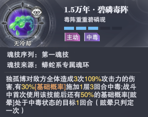 首先独孤博在开场便会对敌人全体施加持续2回合的2层中毒状态,而接着独孤博的技能【碧磷毒阵】便有不低的几率对中毒的单位造成眩晕: