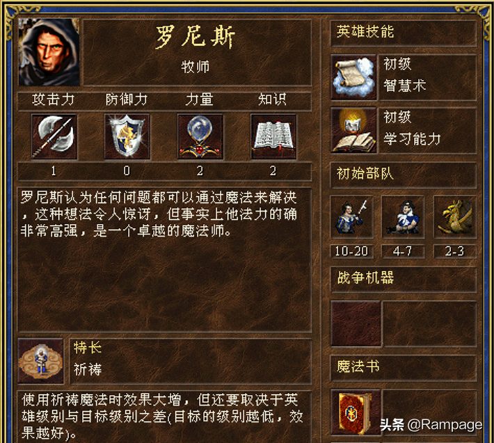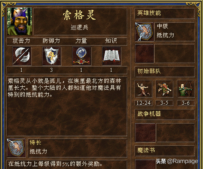 在开始今天的话题前,先和朋友们道个歉,左右的技能特长漏掉了理财术和抵抗力。理财特是人族的罗德哈特,他没死的时候是人族的理财特,死后是亡灵的黑暗骑士特。抵抗力特长是壁垒的索格灵,抵抗力特长和防御术特长道理是相通的,等级越高越强,在20来级就结束的游戏中,其实用处不大。