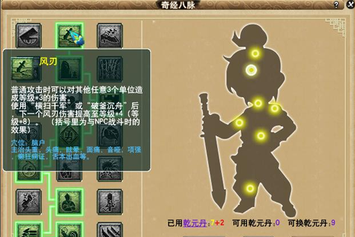 每个门派的奇经八脉有2种分支,奇经八脉从69级开始可以点。我们需要用一定的经验和钱去门派师傅处换取乾元丹,然后点开奇经八脉面板,消耗乾元丹学习奇经八脉里的附加技能和属性。