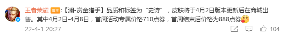 澜的赏金猎人皮肤,品质是史诗,会在4月2号更新后上线。如果不是猴子机甲皮肤的返场,这款皮肤铁定是会在周五上线的。不过现在只是推迟了一天,其实也没什么差别。而且,虽然是周六,但其中也还在工作日内。所以,严格上来说,王者荣耀一周一款新皮肤并没有被打破。