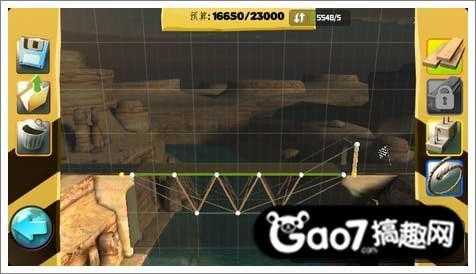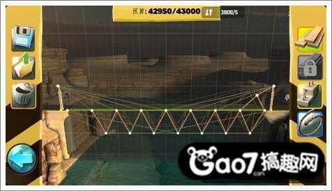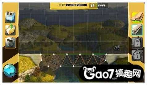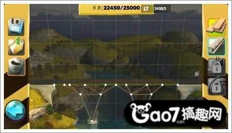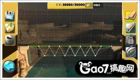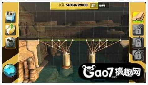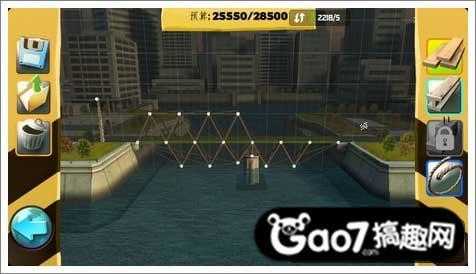 第三关:这关需要利用好河里的两个地基,用钢条从地基开始搭建成等腰三角形,才能支撑住桥的压力。