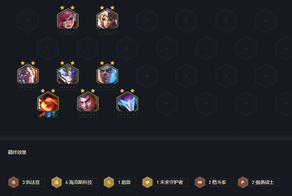 第二套阵容就是比较主流的以海克斯科技搭配强袭战士为主的玩法,这套玩法已四费卡希维尔为核心输出,以当前版本被增强的海克斯科技羁绊为核心,搭配上强袭战士凑成一套强力阵容,但不由于海克斯科技技能里面除了牛头之外缺少坦度足够的前排,所以在这里我们不选择搭配四强袭战士,毕竟两强袭战士带给希维尔的输出就完全足够,只要前排够硬希维尔才能打出足够高的输出。