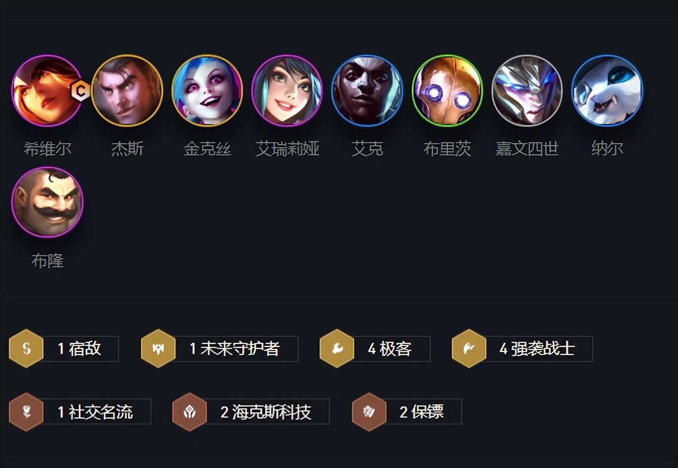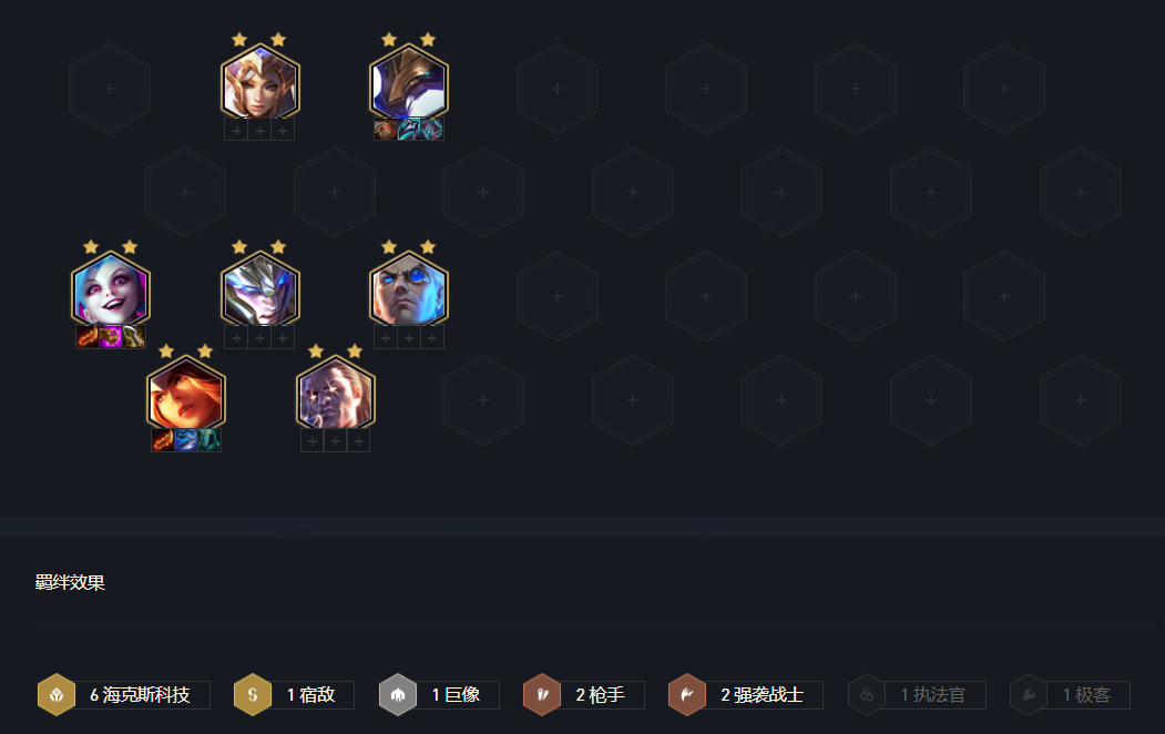 最后一套虽然在当前版本比较少见,但在最近逐渐流行了起来,就是四极客搭配四强袭战士然后搭配上两个海克斯核心组成的阵容,这套阵容可以说是海克斯科技羁绊的一个拼多多玩法,这套阵容的核心是利用极客将装备优势最大化,然后在让希维尔有足够的前排输出,加上金克斯补足AOE伤害,其实和六海克斯羁绊玩法有着异曲同工之妙,只不过这套阵容可以避开版本大部分主流英雄,用一些比较冷门的英雄组成一套强度不俗的阵容,这套阵容最大的有点便是当前版本成型简单,过渡也比较圆滑。