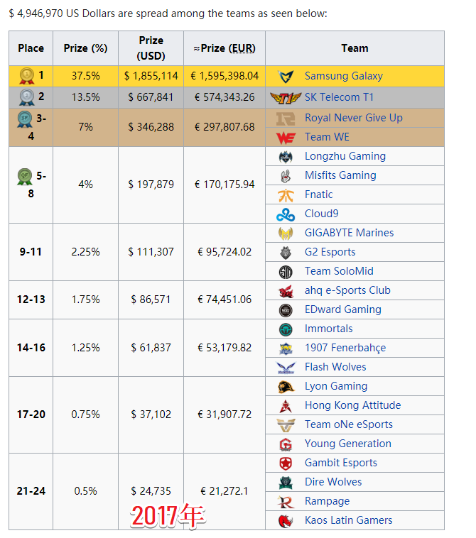 到了2016年,拳头在原有213万美元奖金不变的情况小加入了冠军皮肤奖励分成计划,冠军劫这款皮肤也为当时的冠军奖池贡献了25%的利润分成,最终组成了大约507万美元的超高奖金池,而S6总决赛上获得冠军的SKT更是拿到了翻倍的奖金,一共202万美元,这也是近四年最高的一次奖金了,但是冠军的奖金比例也下降到了40%