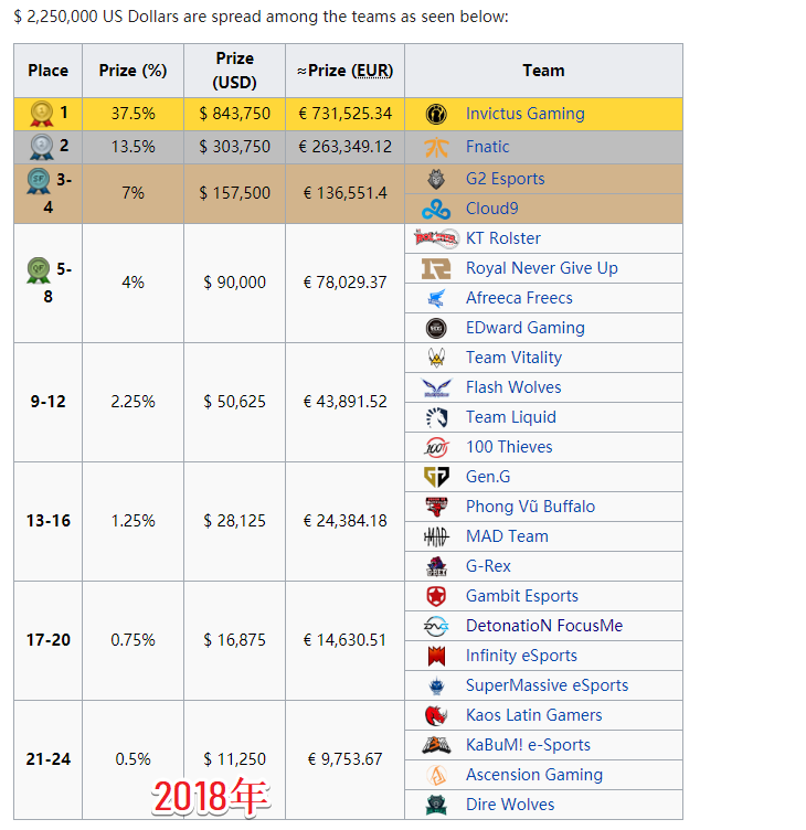 但可以明显的看到今年的iG获得奖金已经下滑到了84万美元,虽然冠军的奖金占比没变,但却是四年来的最低。