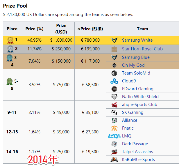 在2014年,SSW独揽了奖金池的46.95%,奖金高达100万美元,而当时奖金池的总奖金为213万美元,作为亚军的皇族只拿到了奖金池的11.74%,25W美元