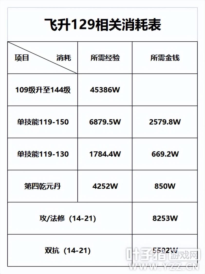 109级升级飞升129级,需要注意的事情有很多。比如升级经验、师门技能、乾元丹、修炼经验等。经过我们综合计算,得出下表。