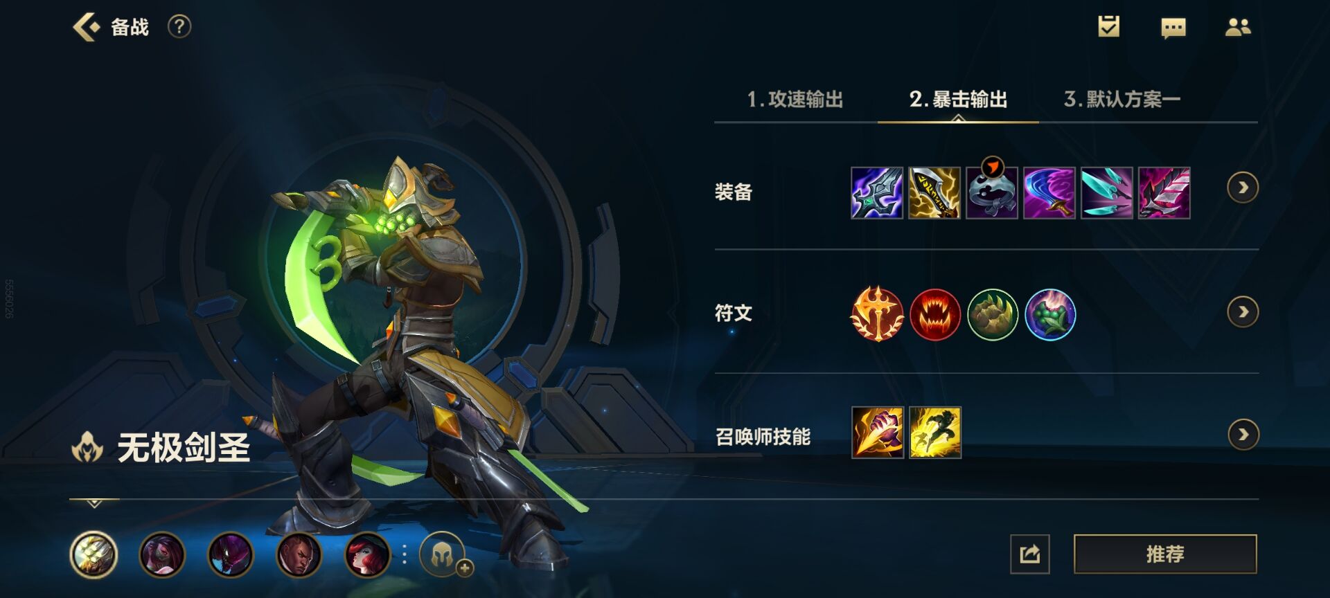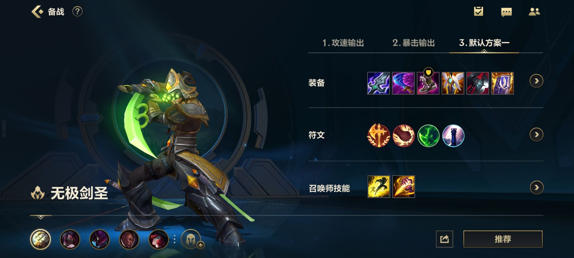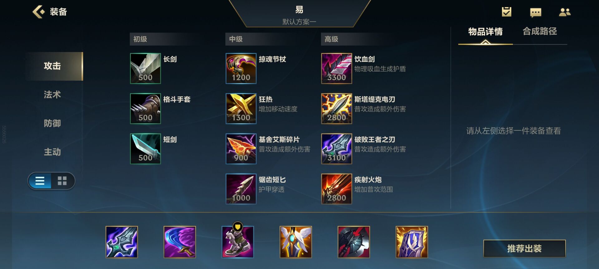 关于装备的搭配也比较简单,以我们最为熟悉的剑圣举例,剑圣的默认配装基本为破败、智慧末刃、水银鞋、复活甲、死亡之舞和绿叉这六件。这六件装备主要将攻速发挥到了极致,以求尽可能最大化触发破败的被动效果和剑圣三技能主动的真实伤害。但这套装备比较明显的缺点便是过于依赖攻击特效,单次平A输出较低,并且在没有真实伤害的情况下会被对方轻松格挡,自身的自保能力也不高。因此,企鹅在上手剑圣的时候,提前在英雄界面——备战页面,额外自己添加了两套装备方案: