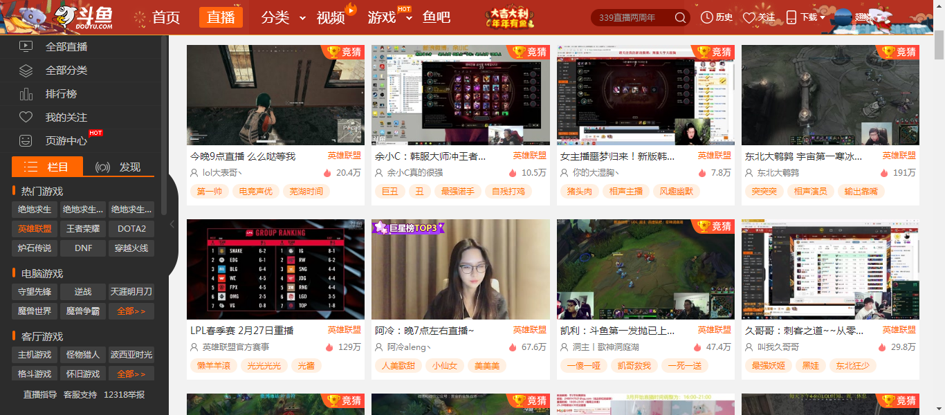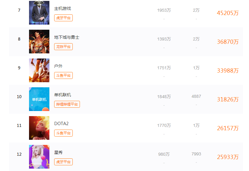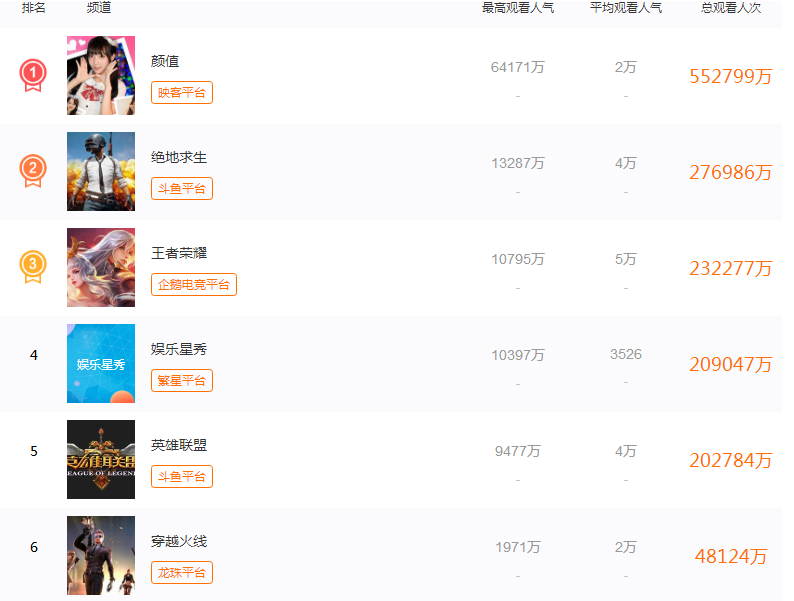 但你以为其他平台就“干净”吗?斗鱼《绝地求生》频道最高同时在线1.3亿!企鹅电竞《王者荣耀》频道最高同时在线1亿!繁星“娱乐星秀”频道最高同时在线1亿!虎牙“主机游戏”频道最高同时在线1953万!龙珠《穿越火线》频道最高同时在线1971万!网易cc《梦幻西游》电脑版频道最高同时在线2442万!触手《荒野行动》频道最高同时在线1560万!B站“单机联机”频道最高同时在线1848万!全民《英雄联盟》频道最高同时在线2263万......假如你把所有平台的所有频道“最高同时在线”人数全部都加起来的话,早已超过地球上所有的人数!地球人真的是闲得很啊,一天到晚不干事,尽看中国的直播了.......